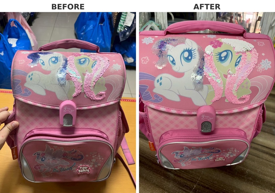 另外,針對如原子筆、鉛筆痕跡等污漬,我們會使用專業清潔劑與技術處理,盡可能淡化痕跡,讓書包恢復較佳的整潔狀態。