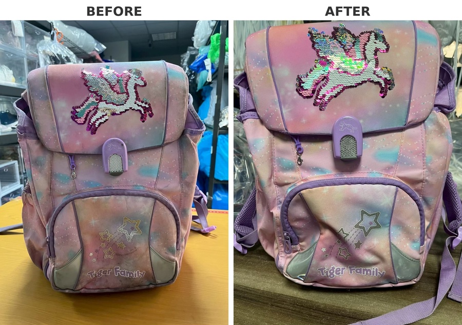 另外,針對如原子筆、鉛筆痕跡等污漬,我們會使用專業清潔劑與技術處理,盡可能淡化痕跡,讓書包恢復較佳的整潔狀態。